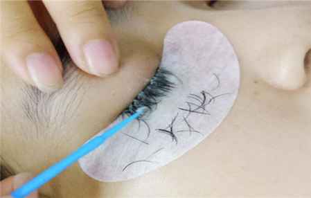 2. 闭上眼睛后,技术会在眼睫毛涂上厚厚的一层清除剂(卸睫毛膏或者卸睫毛液),使眼睫毛完全浸入其中。此时,注意不能碰到眼脸(皮肤),自离开眼睫毛根部l~2mm处涂抹清除剂。