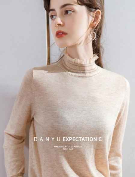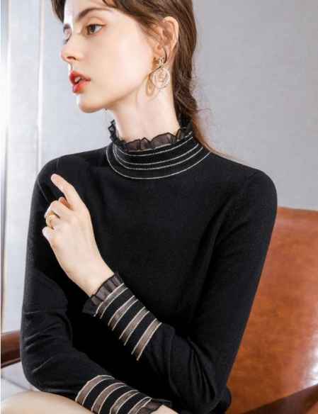 1. 高领衫 高领的打底衫也是要备上的,采用高领的设计,修饰脖颈的线条,上身百搭又显气质,轻松穿出身材的线条感,关键还保暖,不用担心脖子冷。