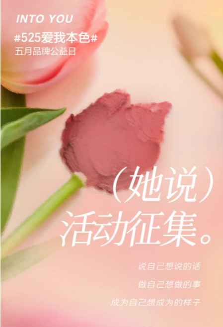 爱自己,让INTO YOU坚持爱我本色,并把这份坚持传递给了更多的女性,让她们在爱与美中找到自我。在#525爱我本色#品牌公益日来临之际,希望每一位女性都能在自己的世界里尽情绽放,拥抱自我,找寻生活中的每一种可能!