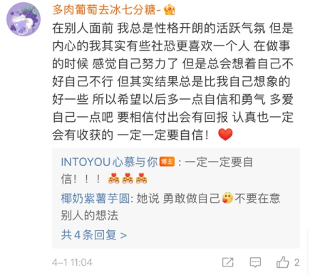 5月25日品牌公益日来临前夕,INTO YOU在微博上以#525爱我本色#为话题进行了系列征集活动,有许多粉丝参与其中。评论中的她们**清醒,告诉自己“我的热情永远不会熄灭在现实的平凡中。”她们自信上进,为目标努力,专心奔赴于自己的愿景……因为有了无数个她们,#525爱我本色#不再是一句口号。