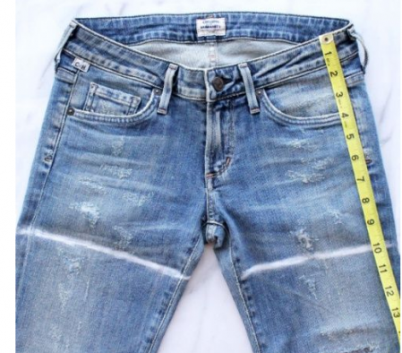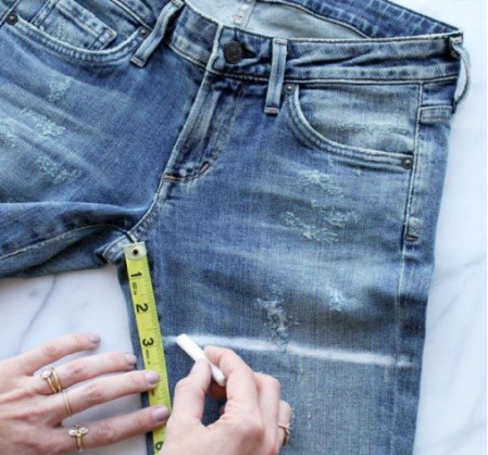 首先,用粉笔标记牛仔布,从内缝向下测量,然后在裤腿上画一条粉笔线。