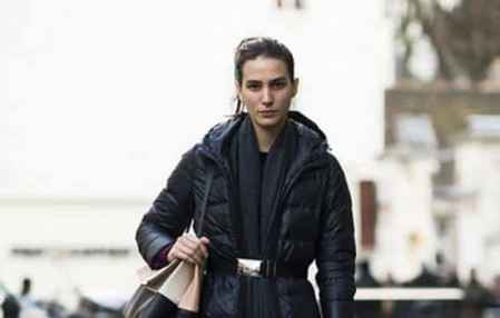 黑色的羽绒服搭配打底袜,显露出苗条的**,不过上半身会显得有些臃肿,但是原本笨重的羽绒服因为加了条抢眼的金属腰带就能变得苗条起来,同时也能点亮冬日的服饰。