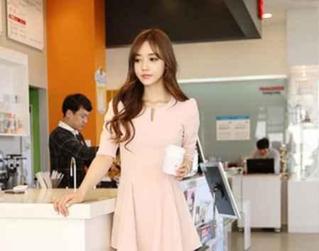 粉色系的连衣裙很是甜美,领口的波浪形设计十分精致,加上腰部的收腰设计,搭配小巧蝴蝶结腰带展现出女生甜美**的一面,脚踩一双裸粉色的尖头高跟鞋,极具甜美气息,裙摆轻盈灵动,让人忍不住想翩翩起舞迷人不已。
