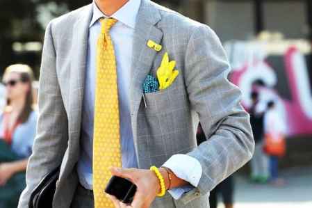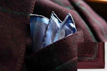 接着,考虑绿、红、蓝、褐和灰黑棉麻,这是一般领带的底色,而领带是袋巾主要搭配对象。在这些颜色上的圆点、格纹与变形虫也是经典,繁复印花很合丝质袋巾,丝绸搭配任何设计都显得华丽。