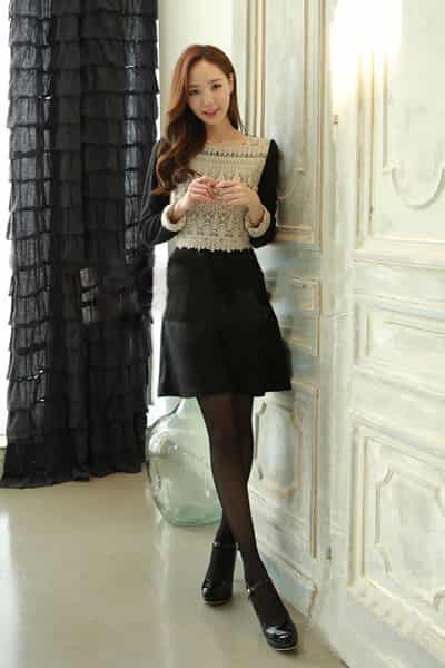这款黑白拼接长袖连衣裙,之前那件有相同之处,却有不同的韵味。在最容易显胖的部位用黑色蕾丝设计,显瘦同时还凸显了精致感,其他细节用白色设计,增添清新感,配黑色**和黑色高跟鞋,柔美而性感。