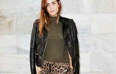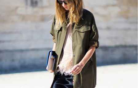 一点点的羽毛装饰作为军绿色外套的内搭,下穿黑色半身裙,十分时尚而女人,绑带尖头高跟鞋的那一点纤细绑带装饰,成功杀出军装风的硬朗重围,让女性变得优雅女人味十足。