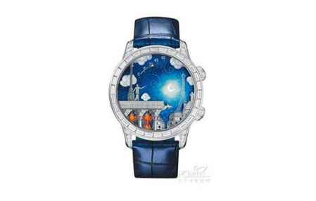 表盘:玫瑰金表盘上纹饰精美的鸢尾花采用人工打磨雕刻,表盘需耗时近 200个小时,9点钟和12点钟方向分别嵌入秒表盘和月相Logo,12个时刻分别镶嵌了11颗硕大的施华洛世奇钻石和1颗蓝宝石,表盘下端采用18K纯金打造鸢尾枝蔓 并同样镶嵌了2颗蓝宝石。